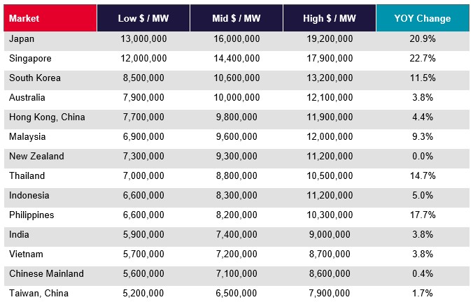 According to Cushman & Wakefield’s latest Asia Pacific Data Centre Construction Cost Guide 2026, Australia sits mid-pack in the region, with construction costs ranging from approximately US$7.9 million (AUD$11.01m) to US$12.1 million (AUD$16.8m) per megawatt (MW), while New Zealand ranges from US$7.3 million (AUD$10.2m) to US$11.2 million (AUD$15.6m) per MW.