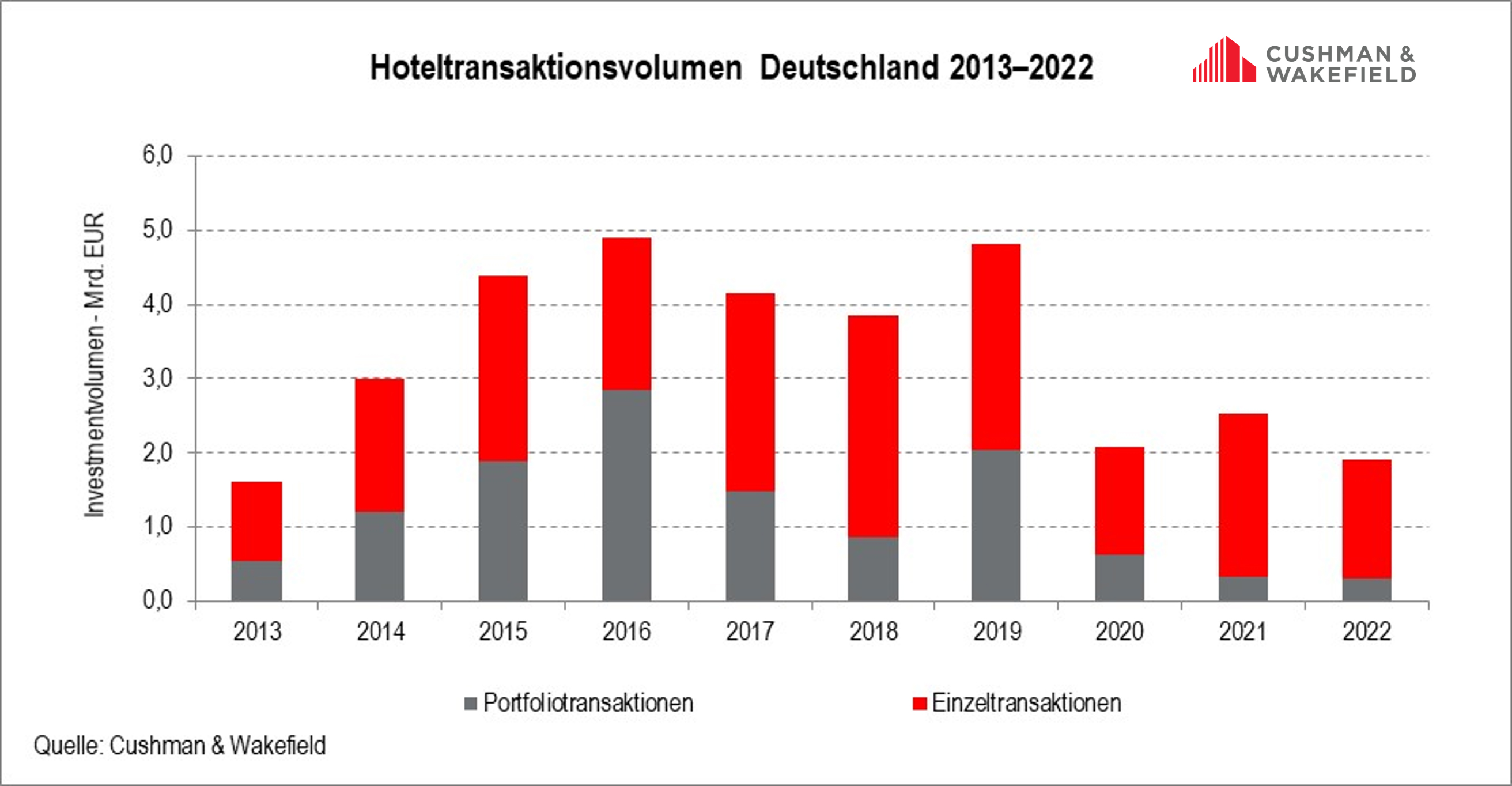 For 2022, international real estate consultancy firm Cushman & Wakefield (C&W) recorded a total hotel transaction volume of EUR 1.9 billion in Germany. This is 25 percent below the previous year's figure and falls almost 60 percent short of the 10-year average. The year was again characterised by single-property transactions, contributing approximately 85 percent of transaction volume. Only four portfolio transactions were recorded. The average transaction size was EUR 29 million.