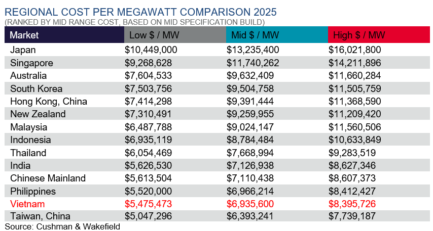 Vietnam continues to be recognized as an attractive destination for data centre investors. According to the Asia Pacific Data Centre Construction Cost Guide 2025 by Cushman & Wakefield, which covers 90 data centre clusters in 26 cities, Vietnam boasts some of the lowest construction costs in the Asia-Pacific region, second only to Taiwan.